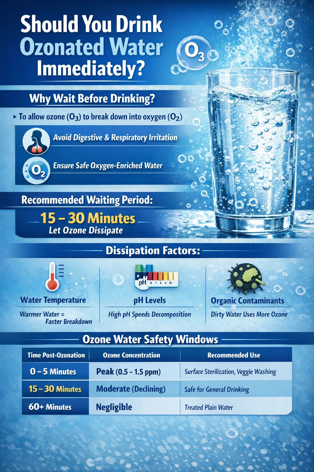 Câu trả lời ngắn gọn là không, thông thường bạn nên đợi ít nhất 15 đến 30 phút sau quá trình ozon hóa trước khi uống nước. Trong khi nước ozone đặc biệt hiệu quả như một thuốc khử trùng , uống nó khi nồng độ khí ozone đang ở mức cao nhất có thể dẫn đến kích ứng nhẹ ở đường tiêu hóa hoặc hệ hô hấp do các phân tử ozone còn sót lại thoát ra ngoài.
