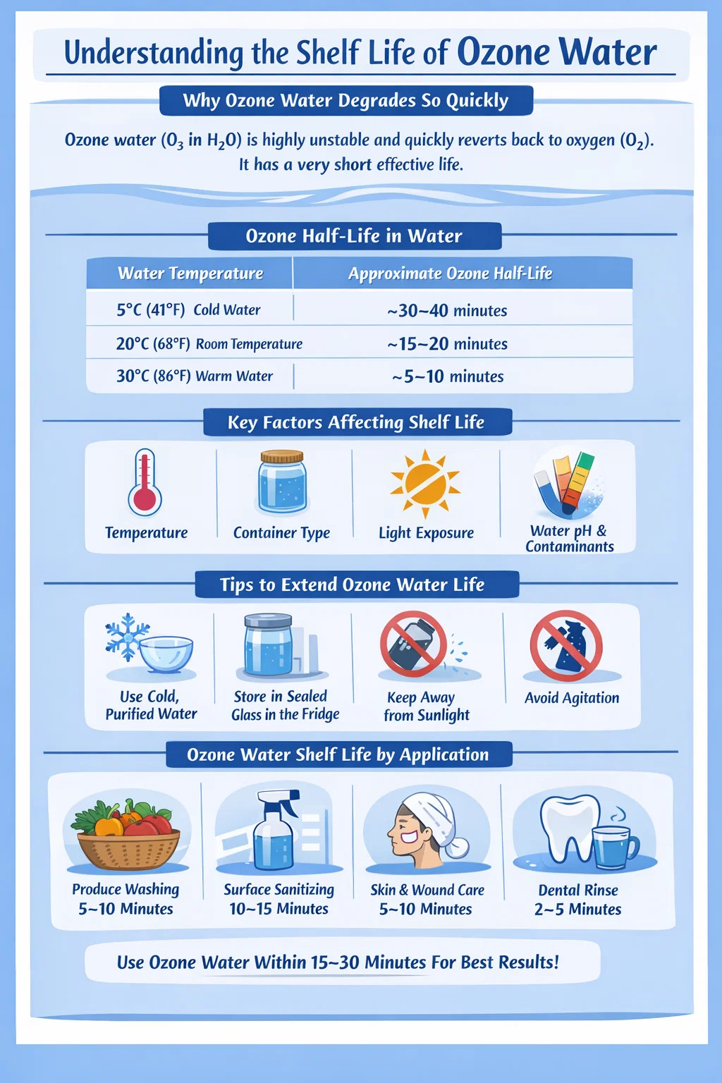 Nhiệt độ là yếu tố ảnh hưởng nhất. Nước lạnh giữ ozone lâu hơn nhiều so với nước ấm. Nước ozone được làm lạnh ở nhiệt độ khoảng 4°C đến 5°C có thể duy trì hoạt động ozone có thể đo được trong tối đa 30 đến 45 phút, và trong các hộp thủy tinh đậy kín, một số ozone dư có thể tồn tại lâu hơn một chút. Ở nhiệt độ phòng (20°C đến 22°C), bạn thường phải làm việc trong khoảng thời gian từ 15 đến 20 phút trước khi xảy ra sự xuống cấp đáng kể. Ở nhiệt độ 35°C trở lên, nước ozone về cơ bản trở nên vô dụng trong vòng vài phút.