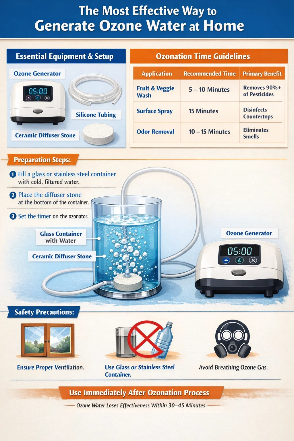 nước ozon rất không ổn định và đạt công suất khử trùng cao nhất ngay sau khi sản xuất. Đối với các công việc gia đình như rửa rau hoặc khử trùng quầy, chu trình sủi bọt từ 5 đến 10 phút trong một lít nước thường là đủ để đạt được hiệu quả. thuốc khử trùng hiệu quả vượt trội hơn nhiều chất tẩy rửa hóa học.